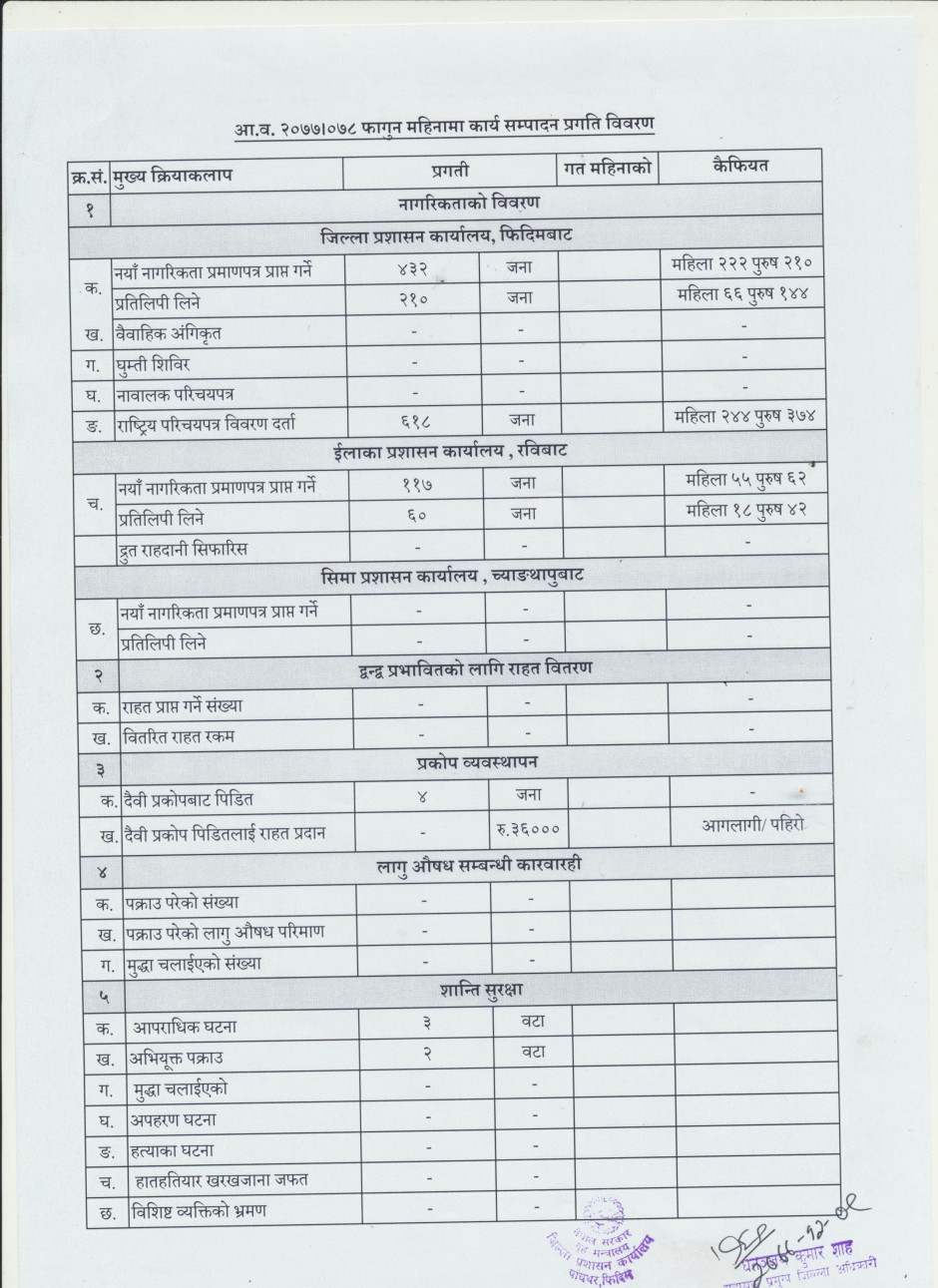 आ.ब. २०७७।०७८ सालको फाल्गुन महिनाको कार्यसम्पादन प्रगति विवरण