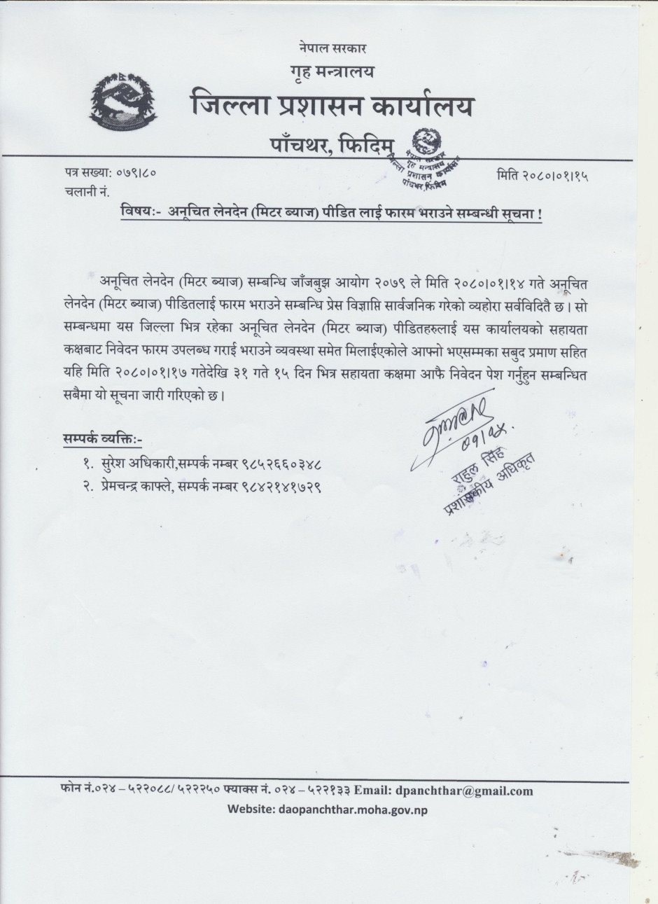 अनूचित लेनदेन (मिटर ब्याज) पीडितलाई फारम भराउने सम्बन्धी सूचना !