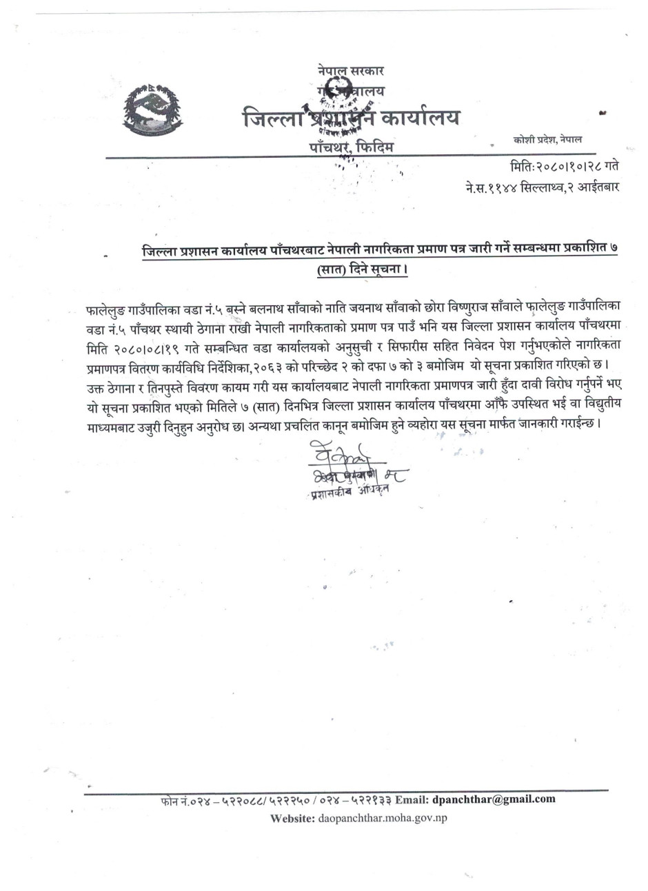 जिल्ला प्रशासन कार्यालय पाँचथरबाट नेपाली नागरिकता प्रमाणपत्र जारी गर्ने सम्बन्धमा प्रकाशित ७ दिने सूचना ।