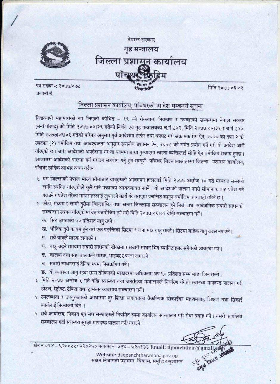 जिल्ला प्रशासन कार्यालय, पाँचथरको आदेश सम्बन्धी सूचना ।