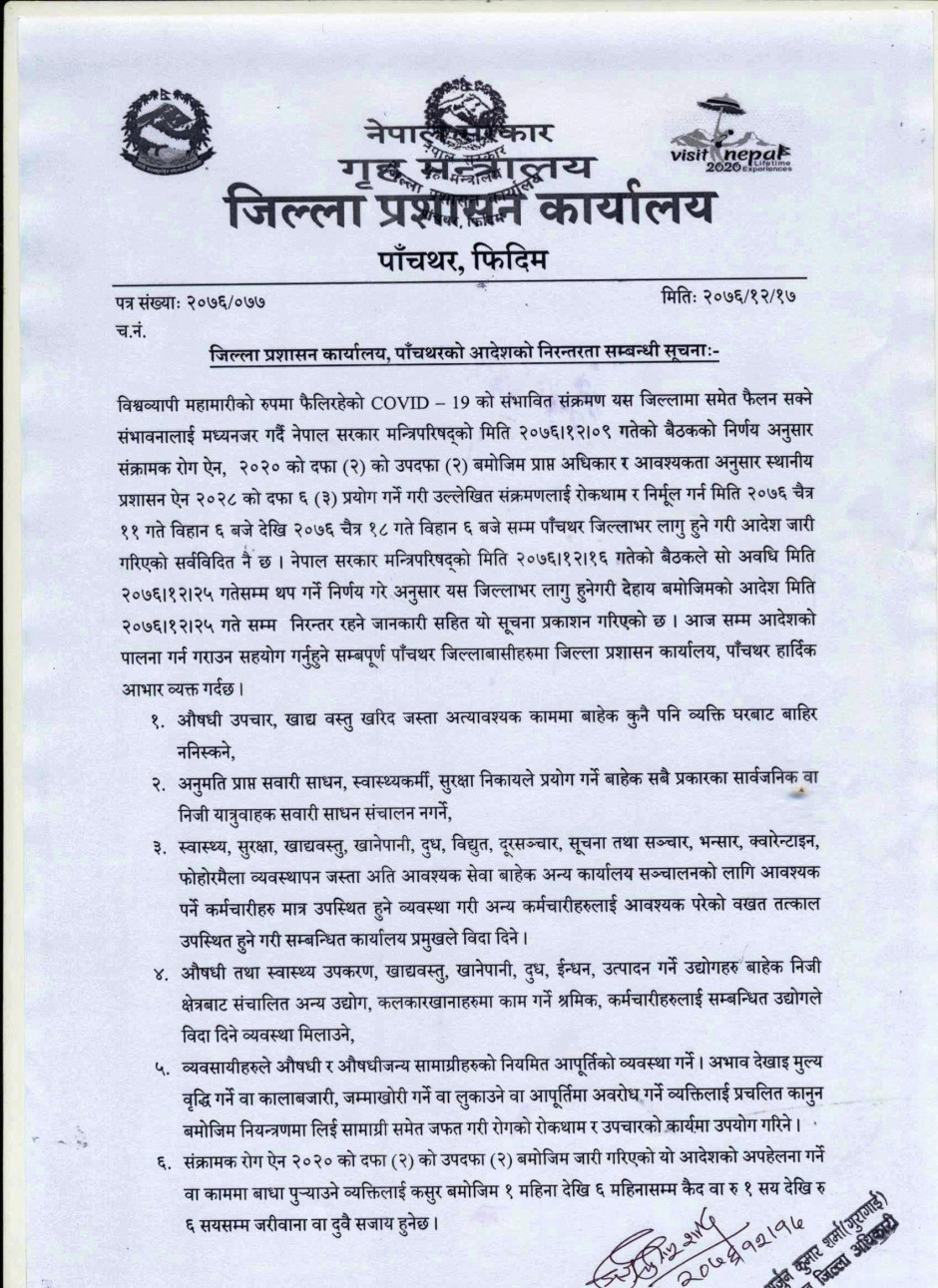 जिल्ला प्रशासन कार्यालय, पाँचथरको आदेशको निरन्तरता सम्बन्धी सूचनाः-