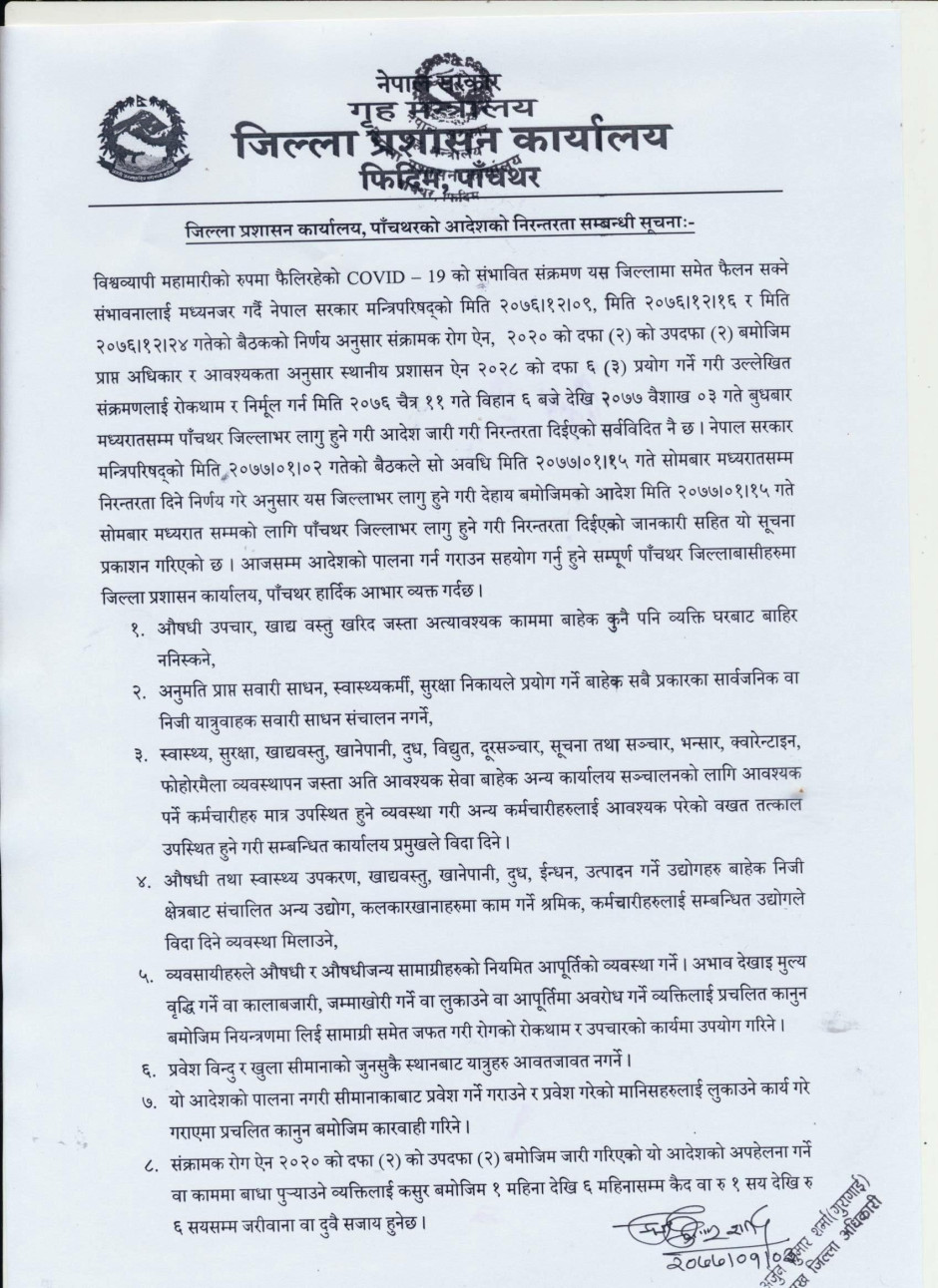 जिल्ला प्रशासन कार्यालय, पाँचथरको आदेशको निरन्तरता सम्बन्धी सूचना
