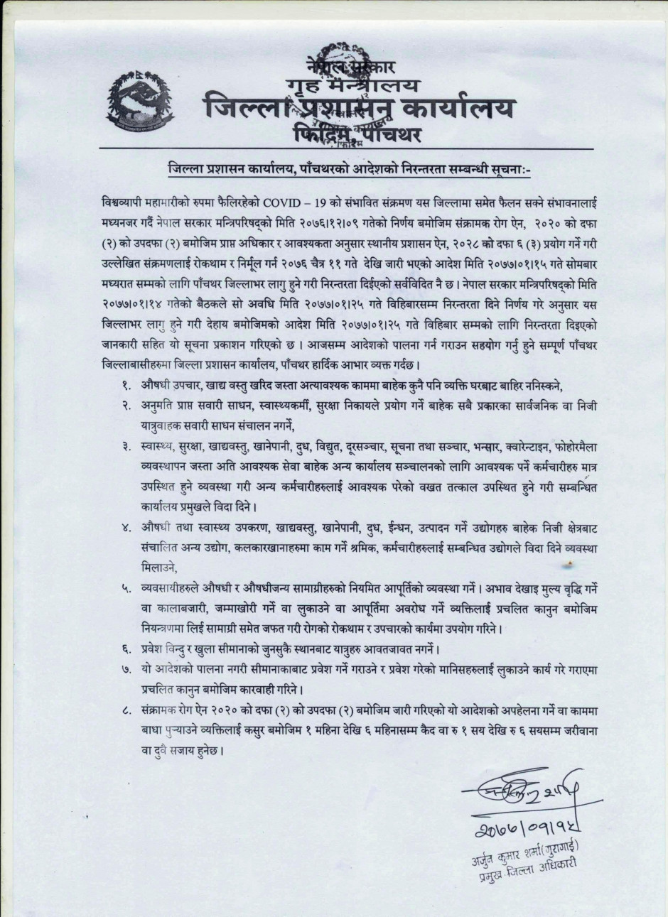 जिल्ला प्रशासन कार्यालय, पाँचथरको आदेशको निरन्तरता सम्बन्धी सूचना