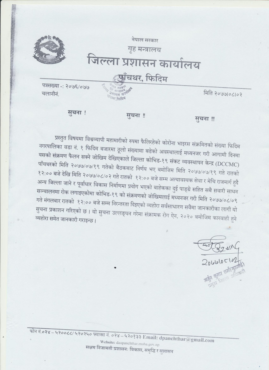 जिल्ला प्रशासन कार्यालय, पाँचथरको अत्यन्त जरुरी सूचना ।