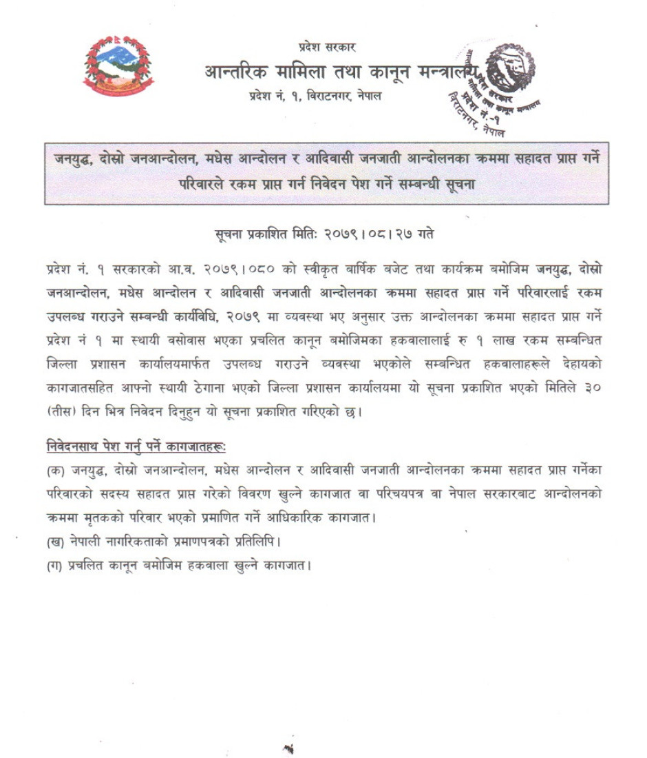 जनयुद्ध, दोस्रो जनआन्दोलन, मधेस आन्दोलन र आदिवासी जनजाती आन्दोलनका क्रममा सहायत प्राप्त गर्ने परिवारले रकम प्राप्त गर्न निवदेन पेश गर्ने सम्बन्धी सूचना