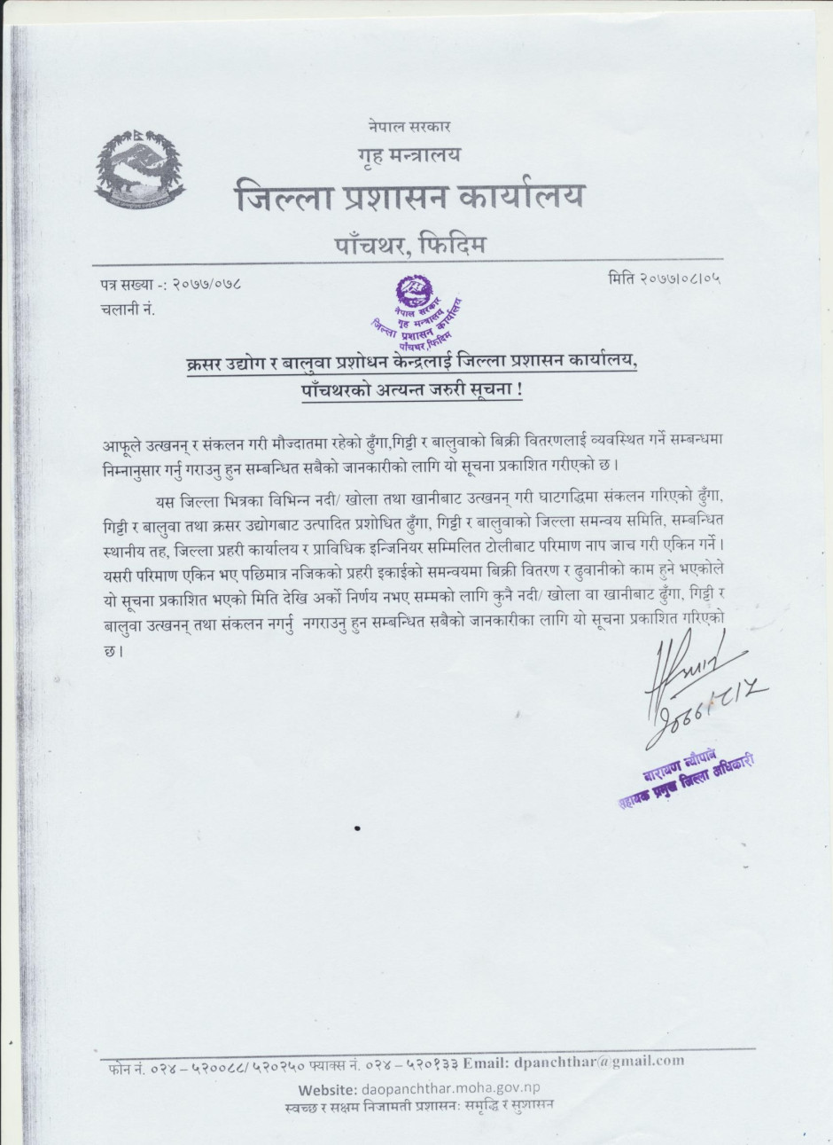 तस्बिर : क्रसर उद्योग र बालुवा प्रशोधन केन्द्रलाई जिल्ला प्रशासन कार्यालय, पाँचथरको अत्यन्त जरुरी सूचना !