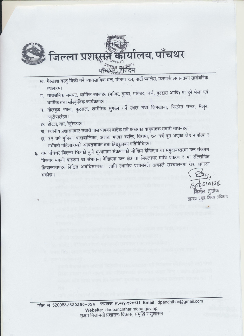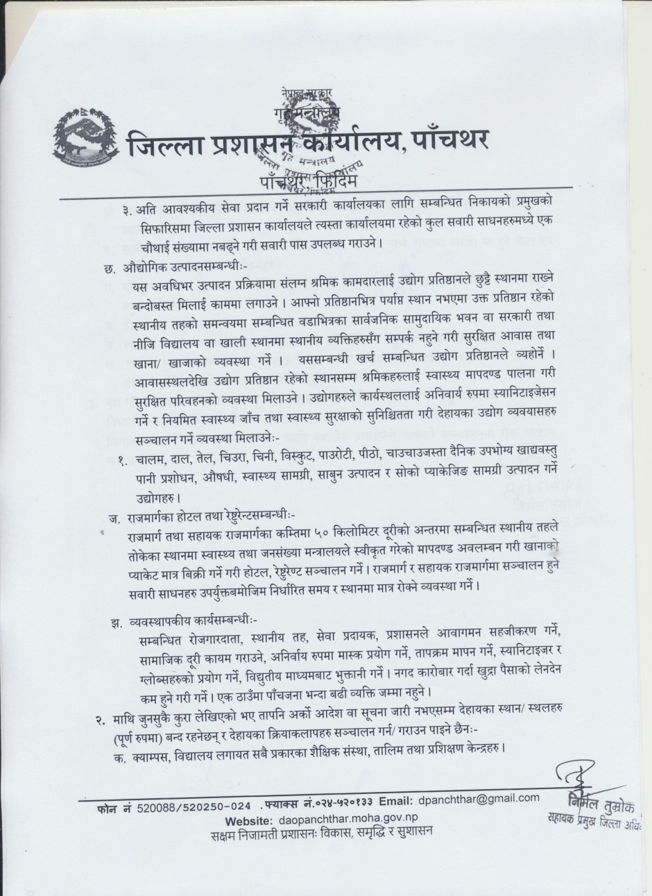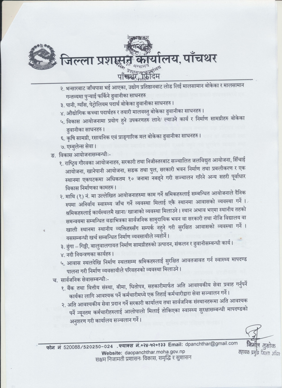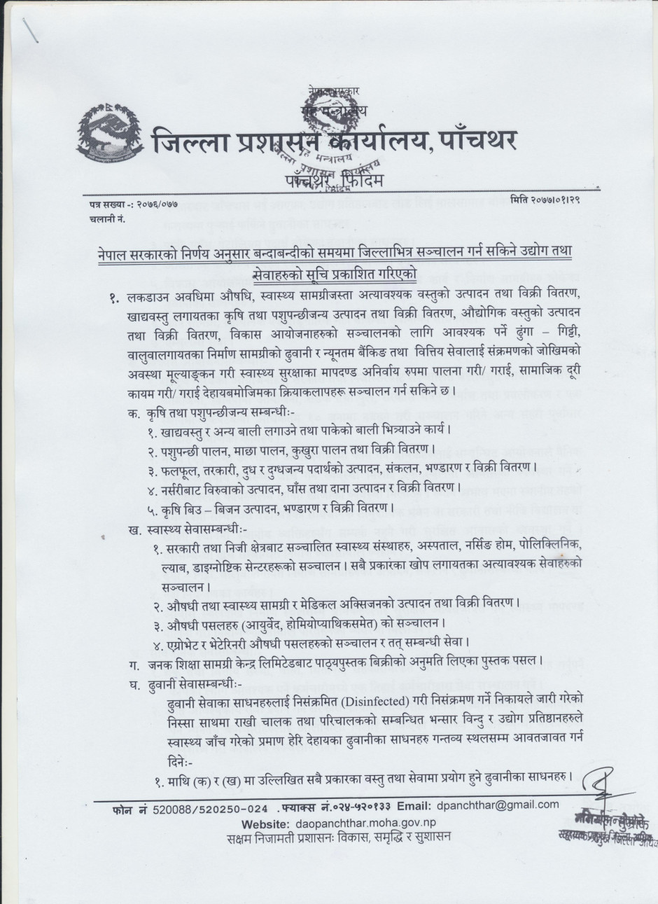 नेपाल सरकारको निर्णय अनुसार बन्दाबन्दीको समयमा जिल्लाभित्र सञ्चालन गर्न सकिने उद्योग तथा सेवाहरुको सूचि प्रकाशित गरिएको