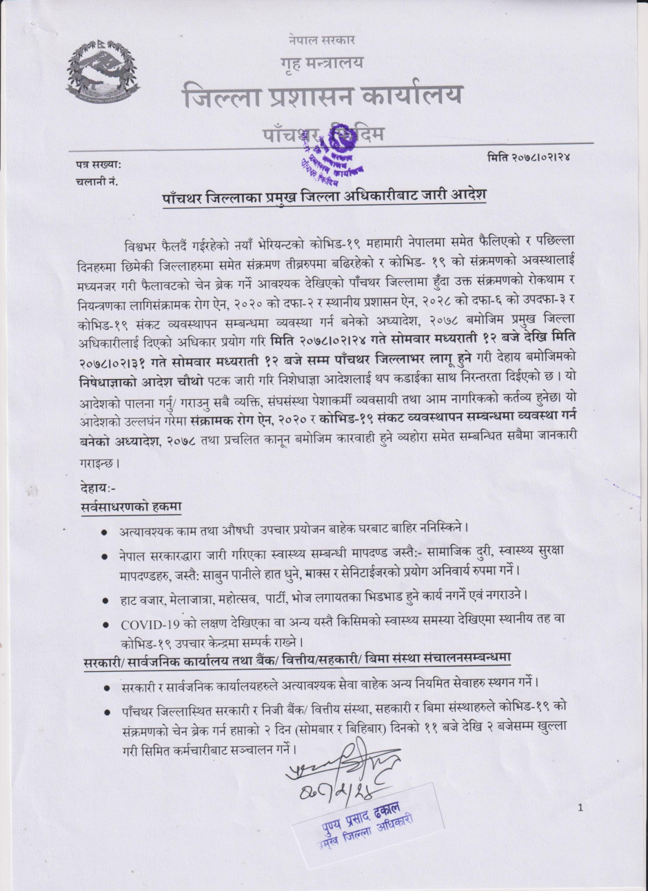 पाँचथर जिल्लाका प्रमुख जिल्ला अधिकारीबाट जारी आदेश, मिति २०७८।०२।२४