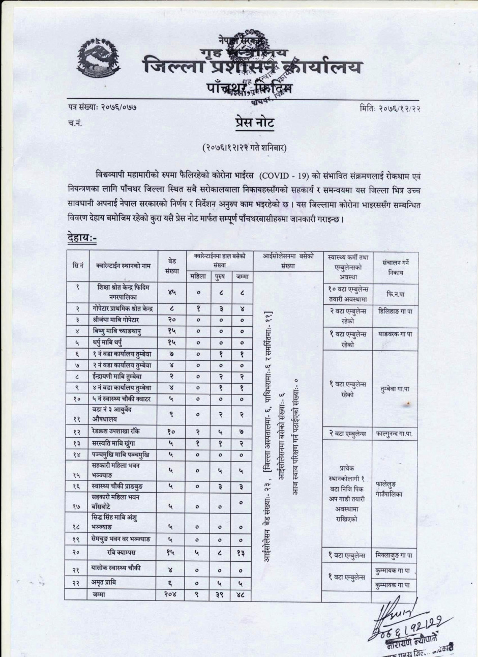 प्रेस नोट २०७६।१२।२२ गते शनिबार