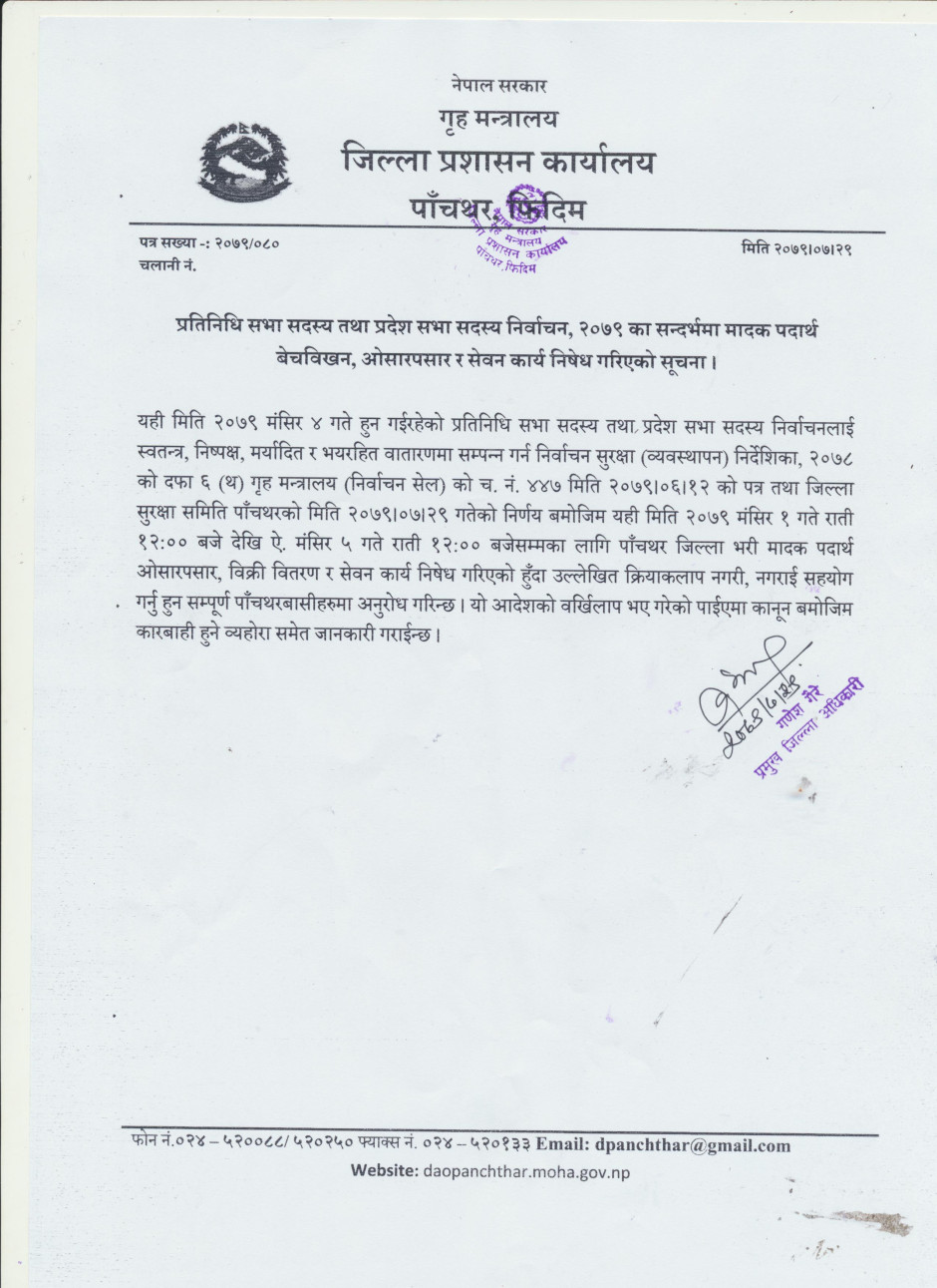 प्रतिनिधी सभा सदस्य तथा प्रदेश सभा सदस्य निर्वाचन,२०७९ का सन्दर्भमा मादक पदार्थ बेचविखन, ओसारपसार र सेवन कार्य निषेध गरिएको सूचना