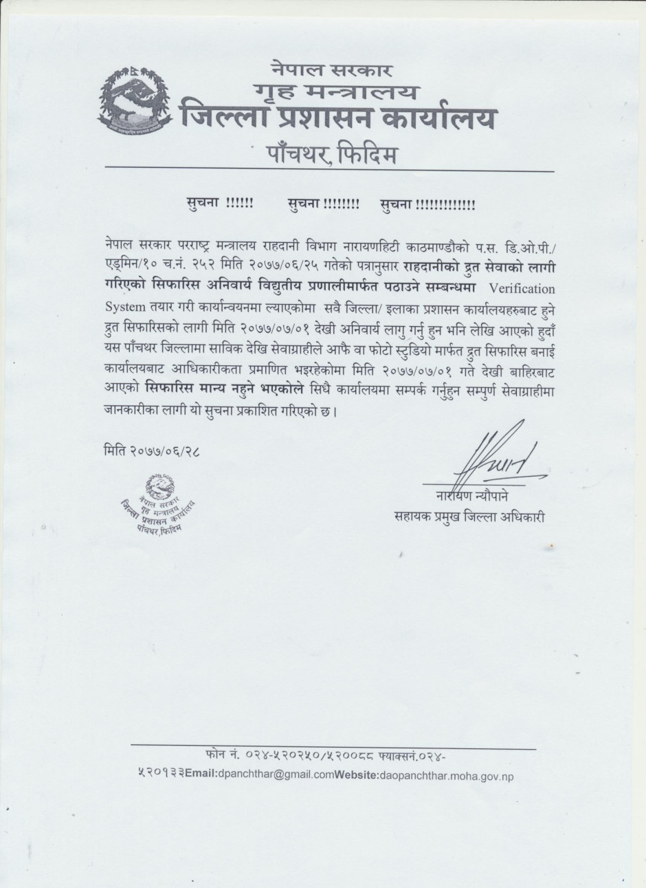 राहदानीको द्रुत सेवाको लागि मिति २०७७।०७।०१ गते देखि सेवाग्राहीले बाहिरबाट ल्याएको सिफारिस मान्य नहुने भएकोले सिधै कार्यालयमा सम्पर्क गर्नु हुन यो सूचना प्रकाशित गरिएको छ ।