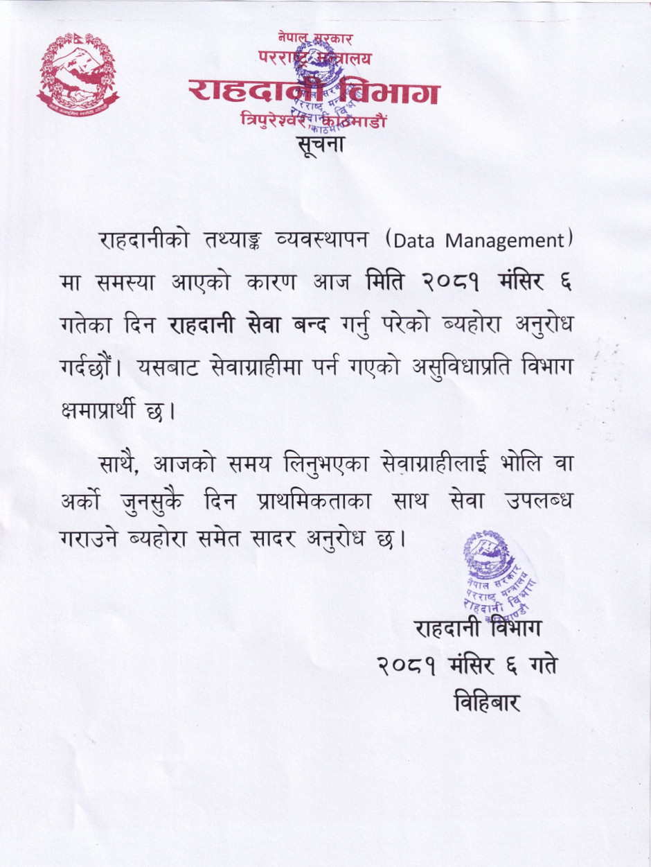 राहदानी सेवा अवरुद्ध सम्बन्धमा ।