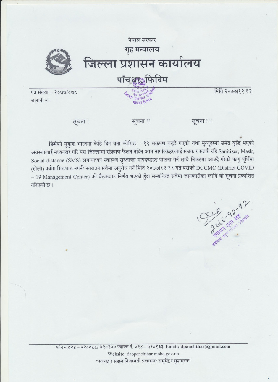 होली पर्व मनाउने सम्बन्धी जिल्ला प्रशासन कार्यालय, पाँचथरको सूचना