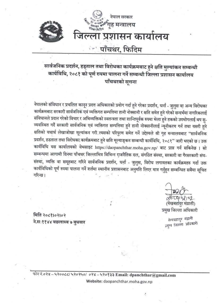 सार्वजनिक प्रदर्शन, हड्ताल तथा विरोधका कार्यक्रमबाट हुने क्षति मुल्यांकन सम्बन्धी कार्यविधि, २०८१ को पूर्ण रुपमा पालना गर्ने सम्बन्धी जिल्ला प्रशासन कार्यालय पाँचथरको सूचना