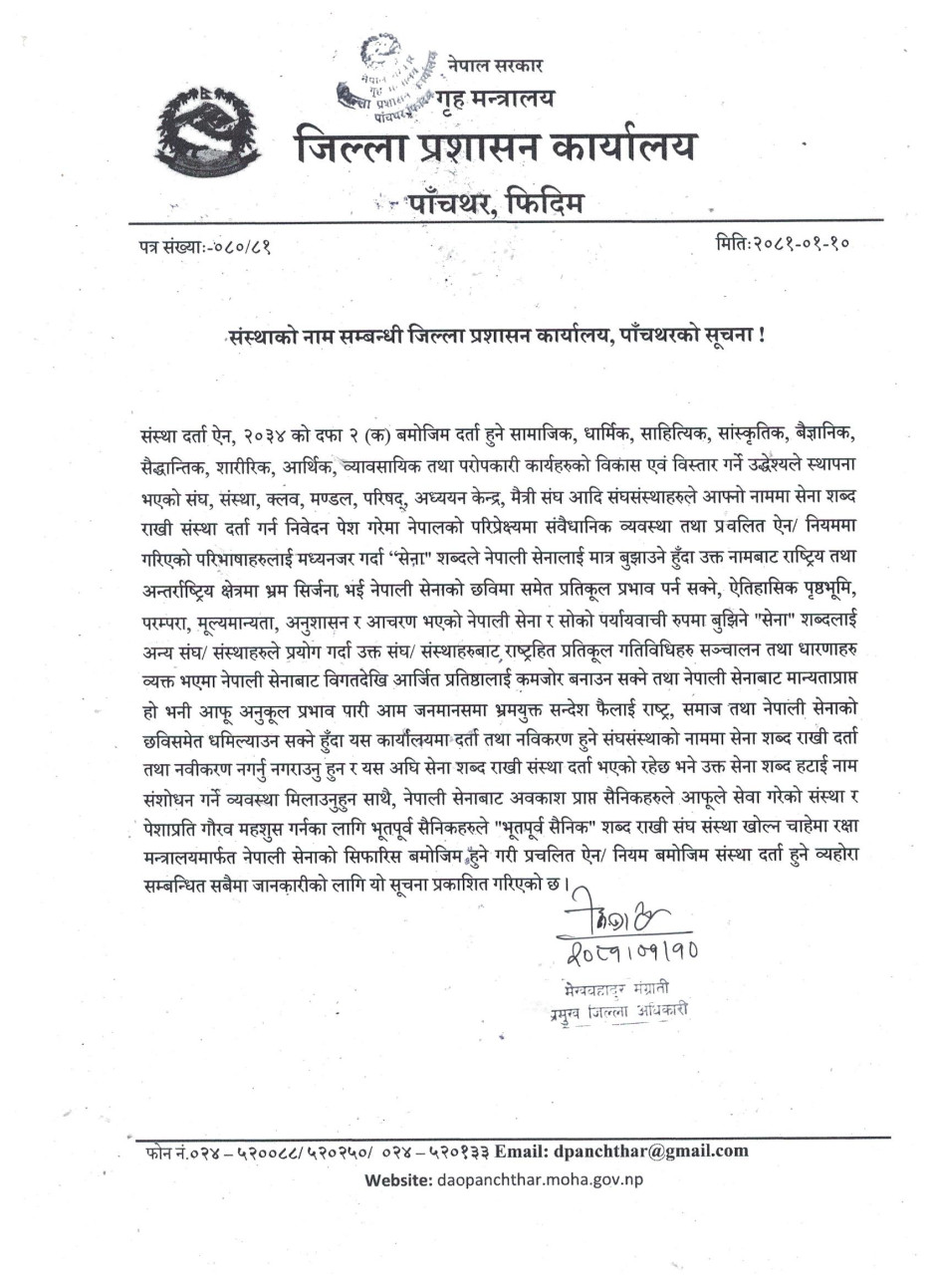 संस्थाको नाम सम्बन्धी जिल्ला प्रशासन कार्यालय, पाँचथरको सूचना !