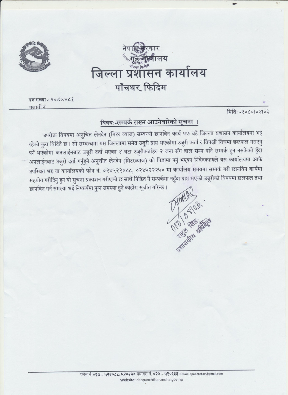 अर्धवार्षिक बुलेटिन २०७६, जिल्ला प्रशासन कार्यालय, पाँचथर