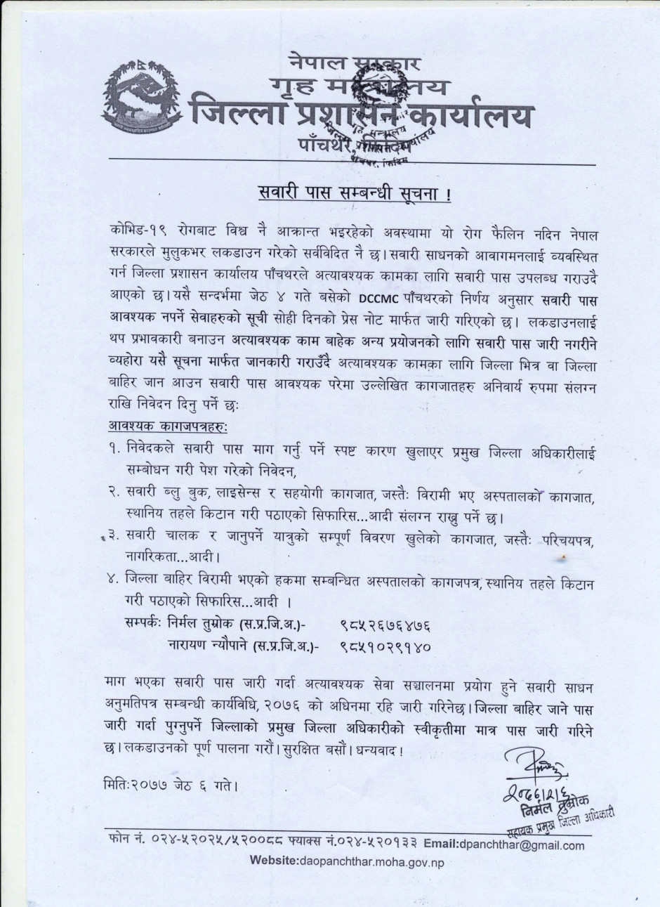 जिल्ला प्रशासन कार्यालय, पाँचथरको सूचनाको हक सम्बन्धी त्रैमासिक प्रकासन । (२०७७ बैशाख १ देखि असार मसन्तसम्म)