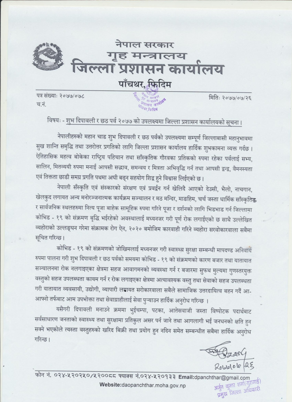 शुभ दिपावली र छठ पर्व २०७७ को उपलक्ष्यमा जिल्ला प्रशासन कार्यालयको सूचना ।