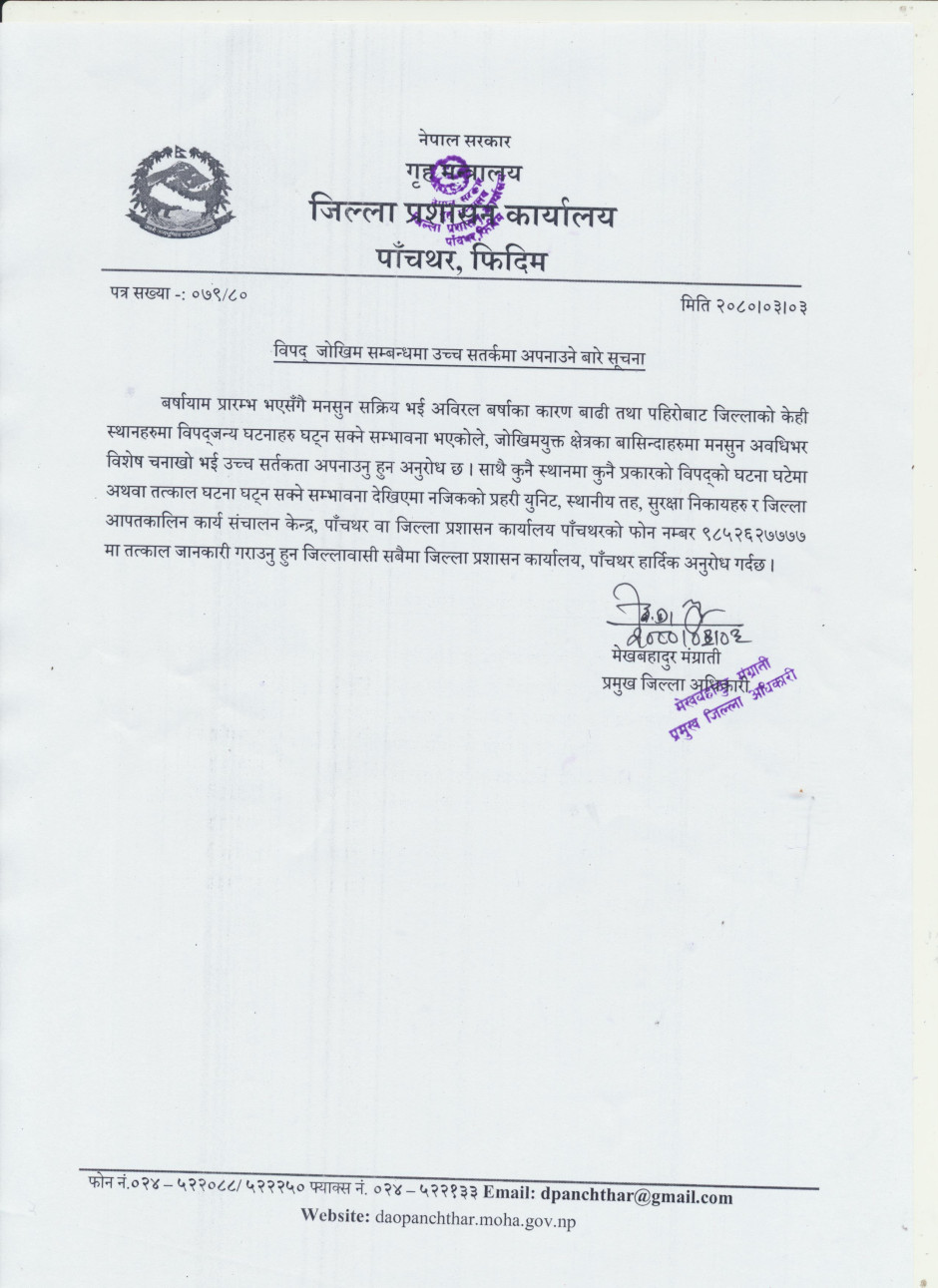 विपद् जोखिम सम्बन्धमा उच्च सतर्कमा अपनाउने बारे सूचना